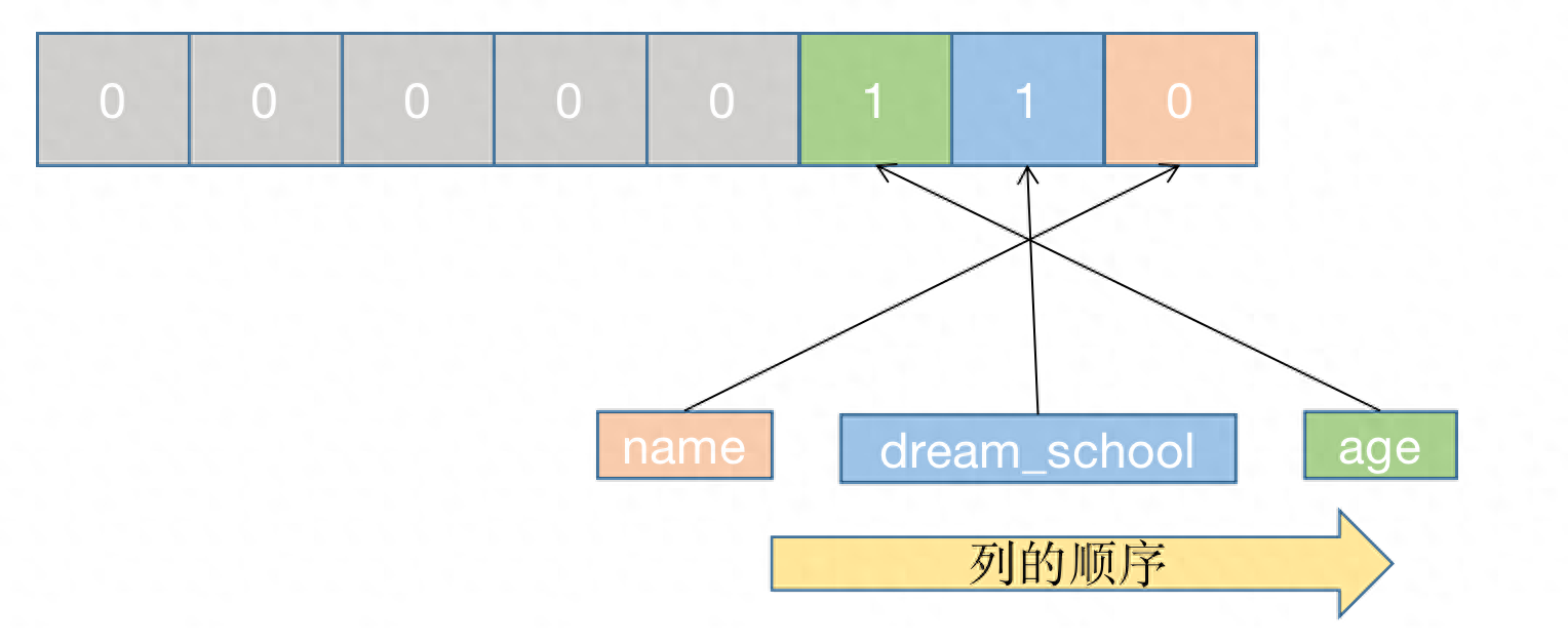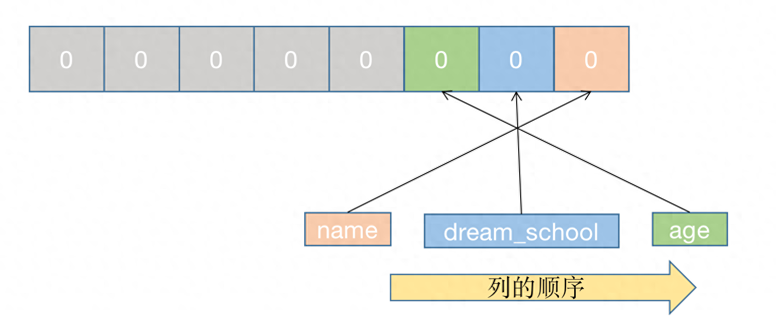 那些变少字段的实真数据占用的字节数会根据列的挨次顺序寄存(后背会说为何要那么设想)。