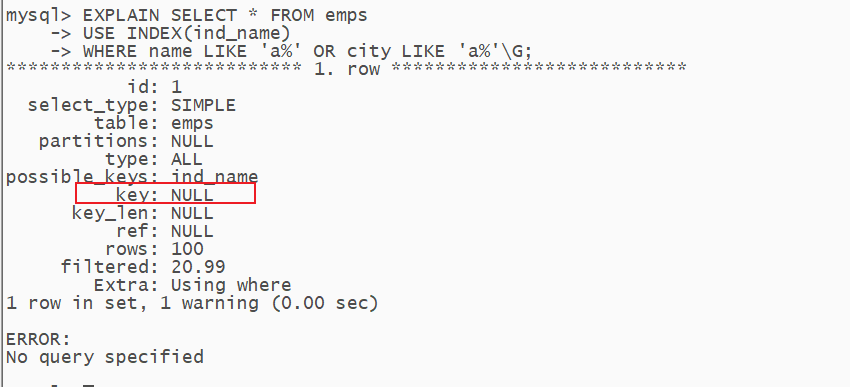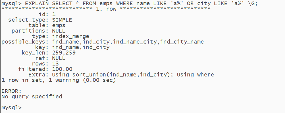 EXPLAIN SELECT * FROM emps WHERE name LIKE 'a%' OR city LIKE 'a%' \G;