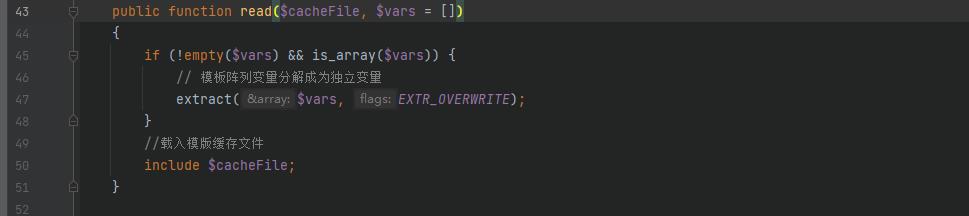 危险危险危险!!这里调用了一个extract函数,可控变量 $vars 赋值给 $this->data 并最终传入 File 类的 read 方法。而 read 方法中在使用了 extract 函数后,直接包含了 $cacheFile 变量。这里就是漏洞发生的关键原因(可以通过 extract 函数,直接覆盖 $cacheFile 变量,因为 extract 函数中的参数 $vars 可以由用户控制)。