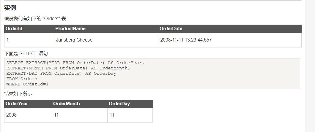 EXTRACT() 函数用于返回日期/时间的单独部分,比如年、月、日、小时、分钟等等。