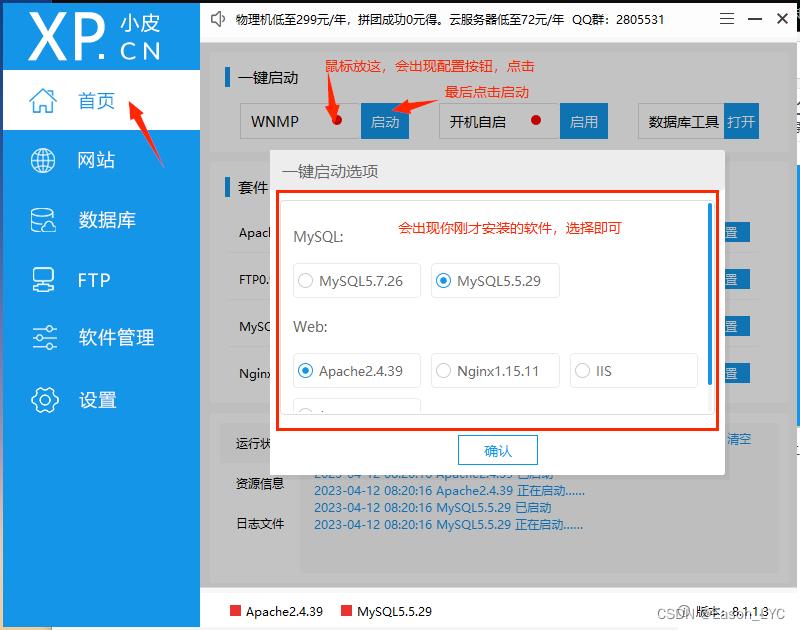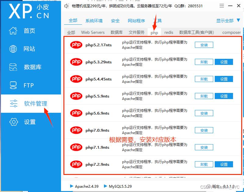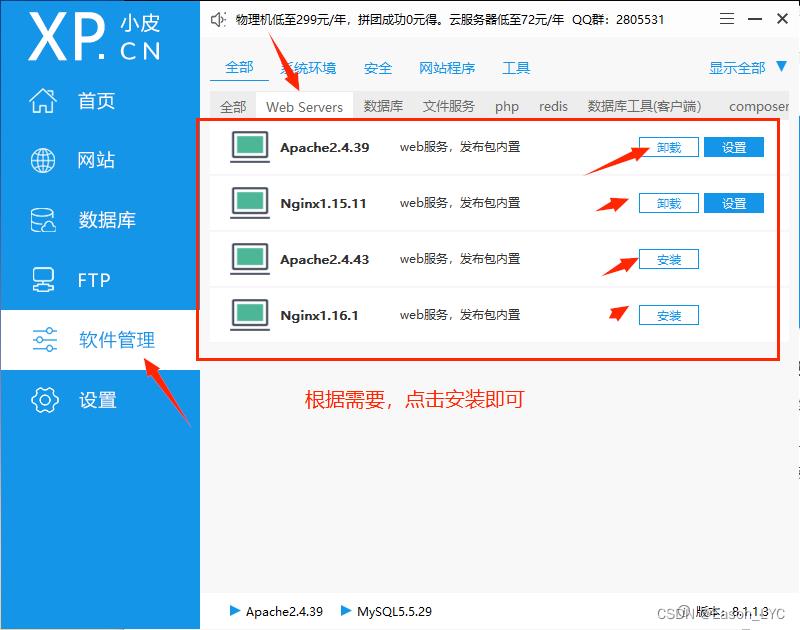 一般需要配置Web Server 、数据库和php 大家可以根据需要安装指定版本软件,点击安装按钮即可。 Web Server 安装apache或者nginx指定版本服务器数据库:安装mysql指定版本数据库php: 安装指定版本的php