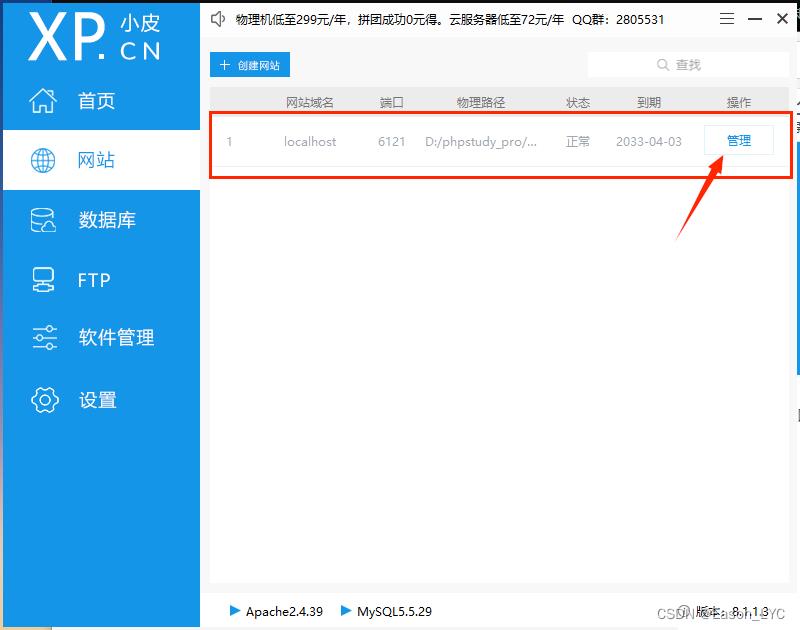 点击管理,里面可以切换php版本、装载php扩展、打开网站根路径和网站启动、停止等常用功能。 点击运行后,就是上面这个样子。
