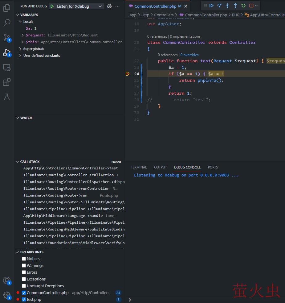 这次我们写一个简单的 Controller 代码(注,我这里用的是Laravel),还是在if这里加个断点(在VS Code的行号左边点击一下即可):
