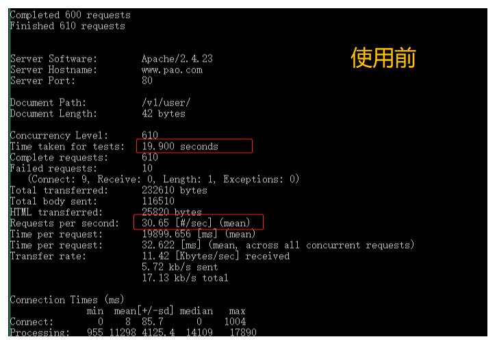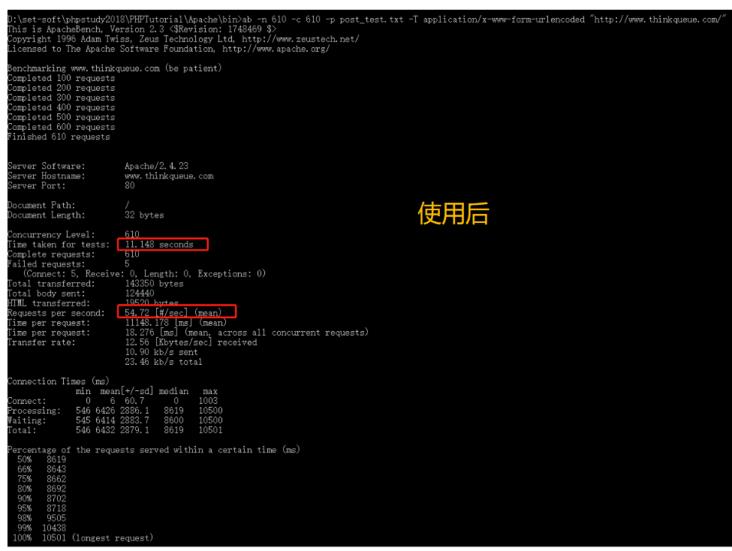 结果使用了消息队列后,同样610的并发,使用时间就缩短了