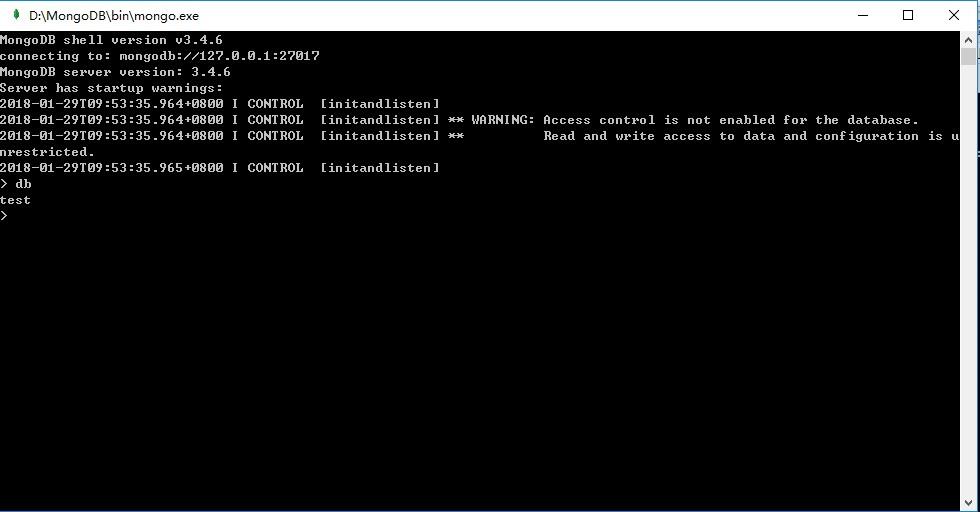 注意:MongoDB中默认的数据库是test,如果你没有创建新的数据库,集合将存放在test数据库中。使用“db”命令可以查看当前的数据库。