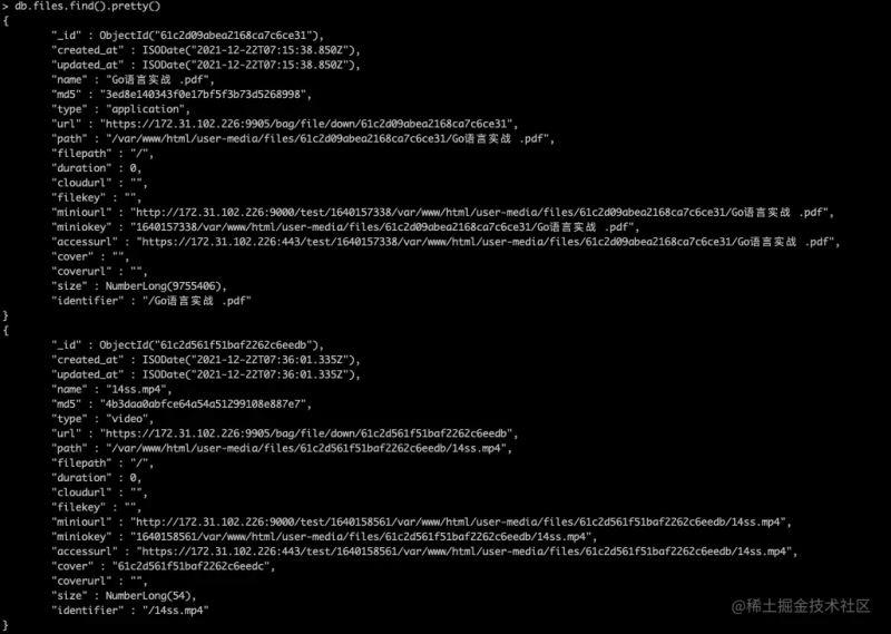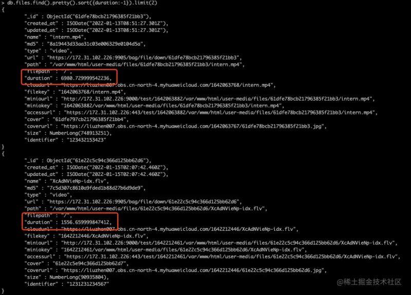 我们按照自己的需要,根据具体的属性查询自己想要的结果,这里演示一个例子。我们先查询视频时长最大的两个文件记录,命令如下: