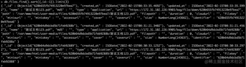 更多的时候,我们比较关心新添加的文档记录,因此,查询的时候最好可以倒序查询文档记录。此时,sort() 方法就被用到了,我们以 _id 属性为例进行说明,命令如下: