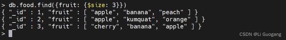 “$size” 条件运算符对于查询数组来说非常有用,可以用它查询特定长度的数组,如下所示。