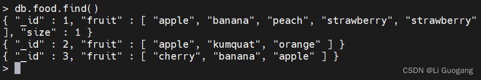 ... {_id: 3, fruit: ["cherry", "banana", "apple"]}