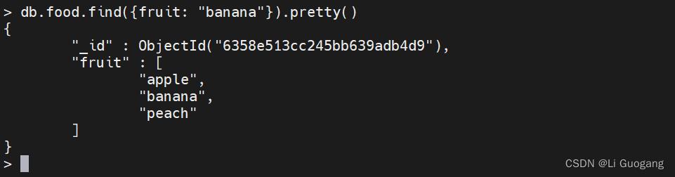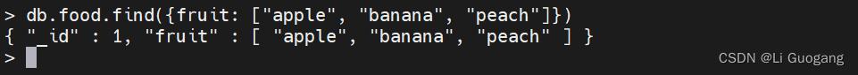 > db.food.find({fruit: ["apple", "banana", "peach"]})