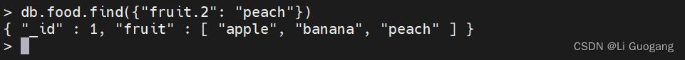 > db.food.find({"fruit" : ["banana", "apple", "peach"]})如果想在数组中查询特定位置的元素,可以使用 key.index 语法来指定下标: