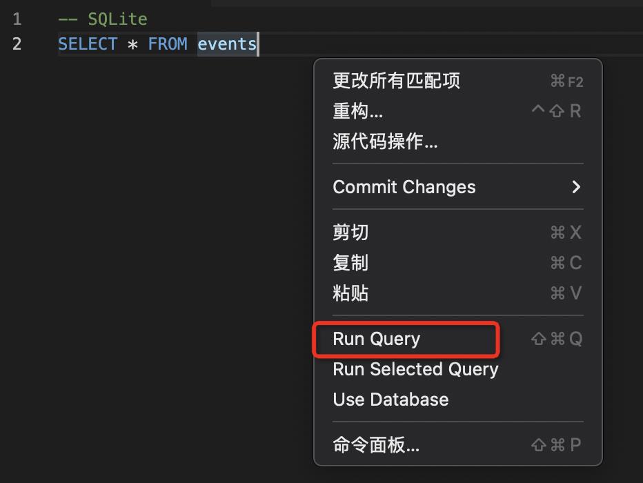 SELECT * FROM events输入查询语句后,右键Run Query执行查询。