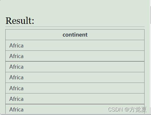 结果执行后查询出来 count(name) 就只是所有 name 这一列的行数的总合,并不能将每个大洲(continent)进行分组统计出来每个大洲所有国家(name)的数量。