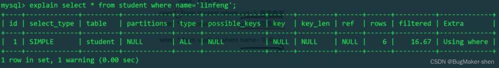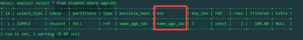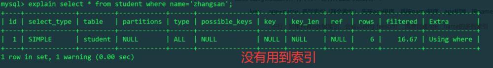 我们看到这里没有用到索引,因为我们用(age,name)创建索引,是先按age排序,再按name排序。如果我们只用name作为过滤条件,这就没有办法使用索引匹配了,因为是优先用age排序。