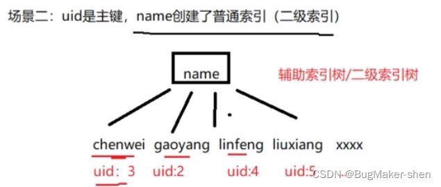 以name为索引构建的索引树,称为辅助索引树,也叫做二级索引树。key是辅助索引字段name的值,然后还有外加uid主键的值