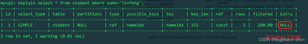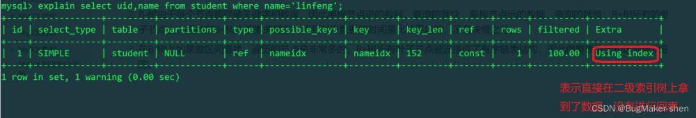 select name from student where name='linfeng';因为过滤字段是name且 只select了name一个字段,name有索引,索引树上直接就有,所以从name的二级索引树上去等值匹配linfeng