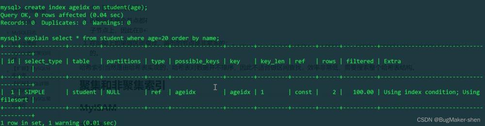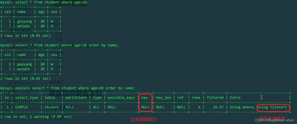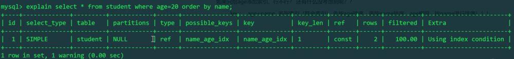 可以看到,age命中索引了,查询age所在的索引树。由于我们写的是select *,依然存在回表。还有using filesort,因为使用age=20查询到的结果是多个,然而name此时是没有顺序的,所以还需要再进行外部排序。