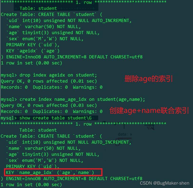 解决方法:我们可以在二级索引树上的key:age+name,形成联合索引,先按age排序,age相同了,再按name排序