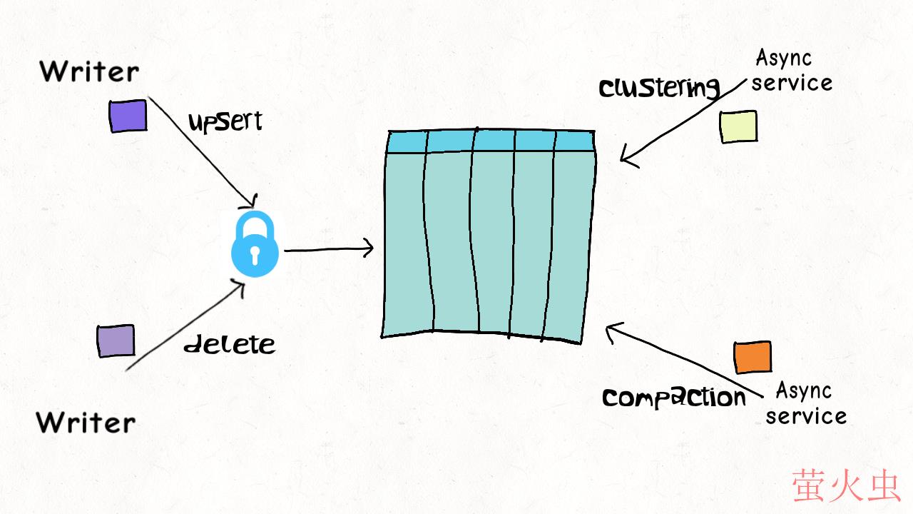 但是并不总是可以将删除序列化到相同的写入流中,或者需要基于 sql 的删除。 对于多个分布式进程,某种形式的锁是不可避免的,但就像真正的数据库一样,Hudi 的并发模型足够智能,可以将实际写入表的内容与管理或优化表的表服务区分开来。 Hudi 提供了类似的跨多个写入器的乐观并发控制,但表服务仍然可以完全无锁和异步地执行。 这意味着删除作业只能对删除进行编码,摄取作业可以记录更新,而压缩服务再次将更新/删除应用于基本文件。 尽管删除作业和摄取作业可以像我们上面提到的那样相互竞争和饿死,但它们的运行时间要低得多,浪费也大大降低,因为压缩完成了parquet/列数据写入的繁重工作。