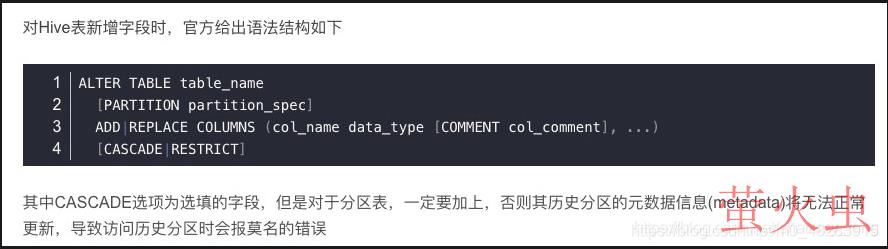 - cascade的中文翻译为“级联”,也就是不仅变更新分区的表结构(metadata),同时也变更旧分区的表结构。