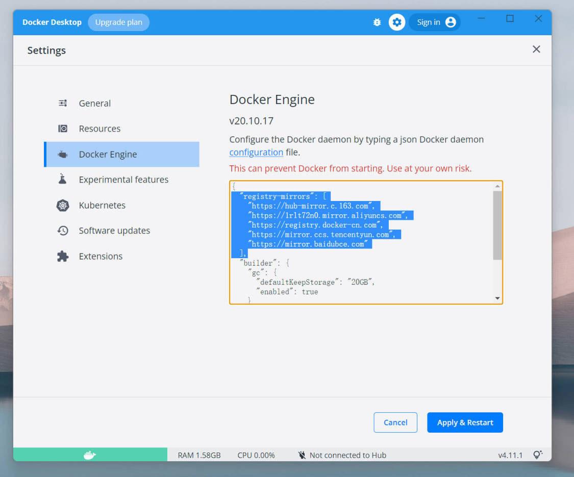 点击右下角的“Apply & Restart”,保存并重启docker。