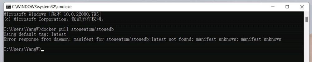先通过页面提供的官方拉取命令docker pull stoneatom/stonedb,在命令行尝试拉取。