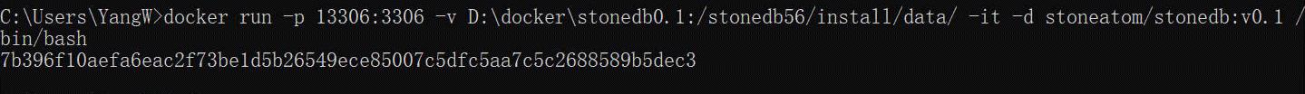 docker run -p 13306:3306 -v D:\docker\stonedb0.1:/stonedb56/install/data/ -it -d stoneatom/stonedb:v0.1 /bin/bash