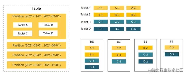 在StarRocks里,一张表的数据会被拆分成多个Tablet,而每个Tablet都会以多副本的形式存储在BE节点中,如下图: