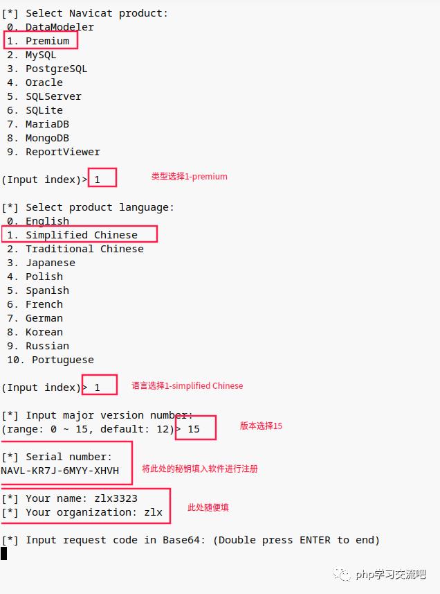./bin/navicat-keygen --text ./RegPrivateKey.pem你会被要求选择Navicat产品类别、Navicat语言版本和填写主版本号。之后一个随机生成的 序列号。