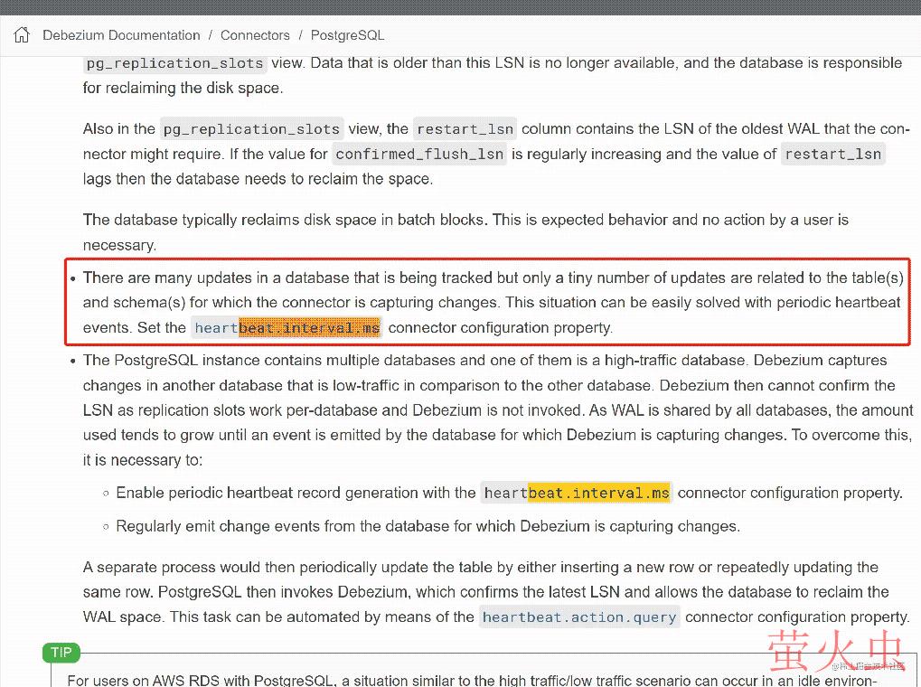 数据库中有许多更新正在被跟踪,但只有极少数更新与连接器正在为其捕获更改的表和模式相关。这种情况可以通过周期性的心跳事件轻松解决。设置heartbeat.interval.ms连接器配置属性。