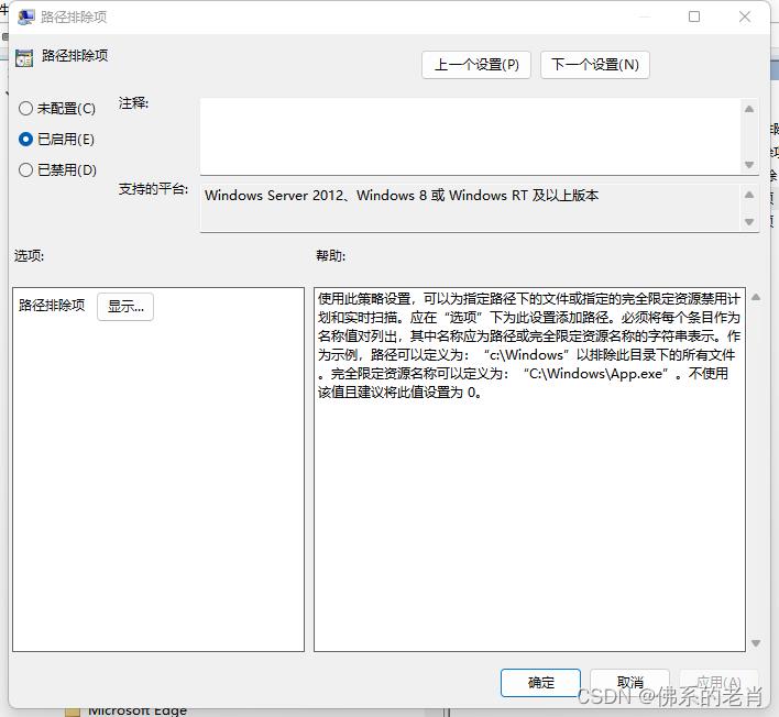 在 管理模板 → windos 组件 → 排除项 中找到 路径排除项