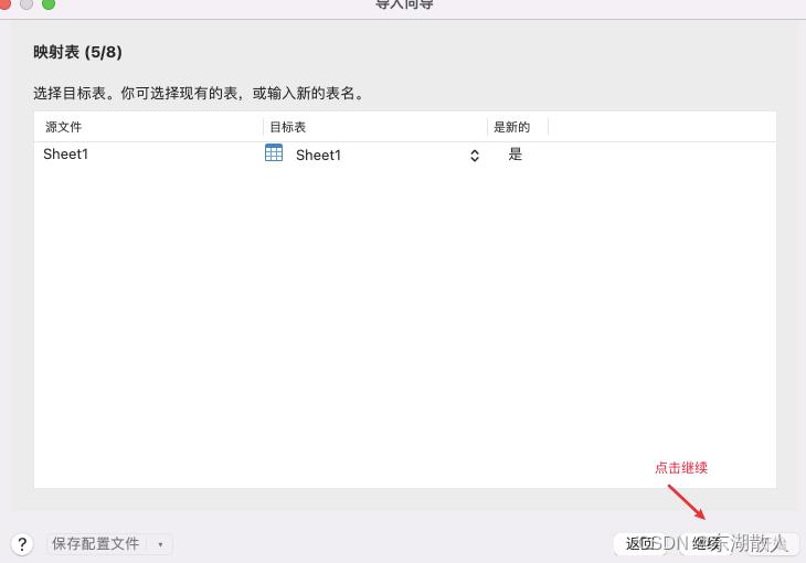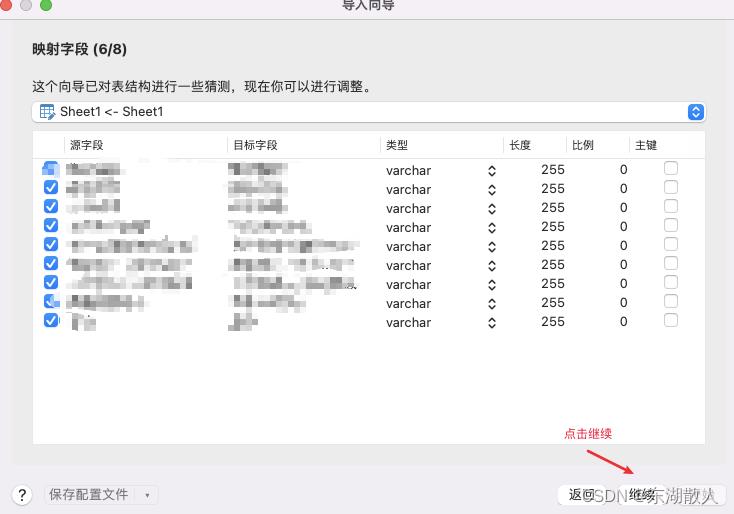 11.映射字段这一步可以对表字段进行一定的调整,在不需要调整的情况下点击继续(默认以刚选择的第一行左右sql 的表字段)