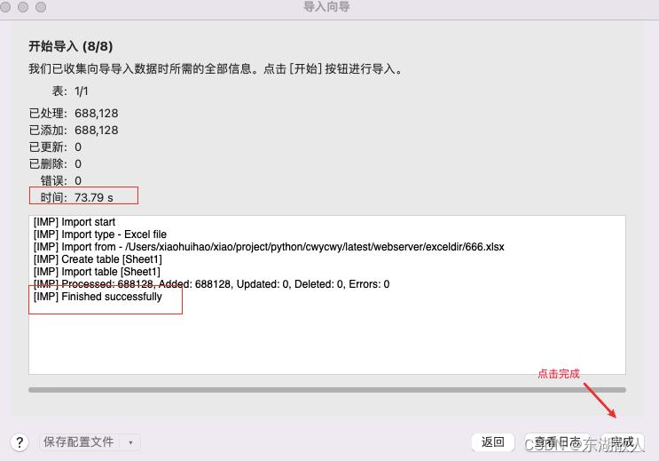 14. 60 多万行数据导入成功,耗时70 多秒,点击完成即可成功导入数据