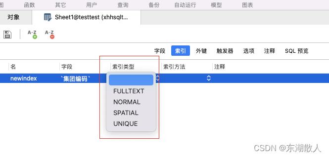 索引类型可以选择 normal (普通索引),一般选择,如果能够明确该列中的任意值都不会重复的话,可以选择unique(唯一索引)、fulltext 为全文本索引,一般用于会被like 的字段处,spatial 索引为空间索引,但使用这个,需要将字段 置为not null(或者能够明确非空),我这里选择了normal(因为我里面的数据是有重复的,非唯一)