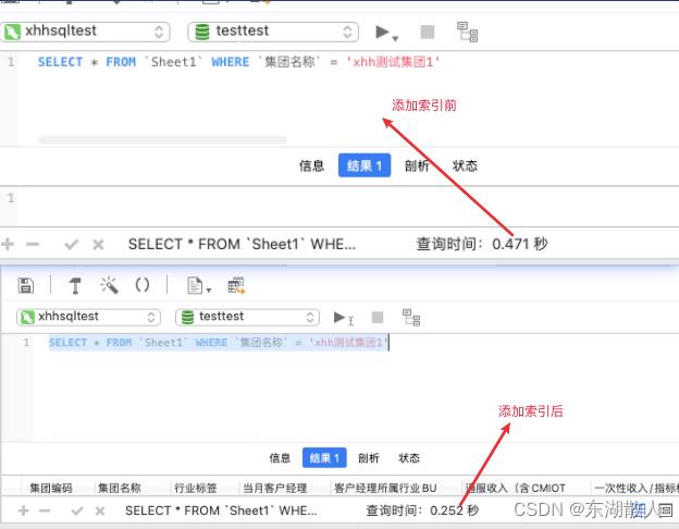 此处是一个加入索引前后的效果对比,可以明显看到,加入索引后,查询速度有了很大的提升哦~