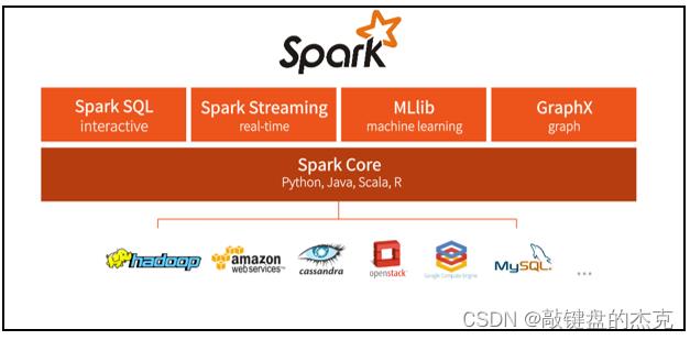 其主要模块有Spark Core、 Spark SQL、 Spark Streaming、 Spark GraphX和 Spark MLlib,不仅可以通过SQL的方式操作数据,还可以对实时数据进行流式计算,同时也支持机器学习;