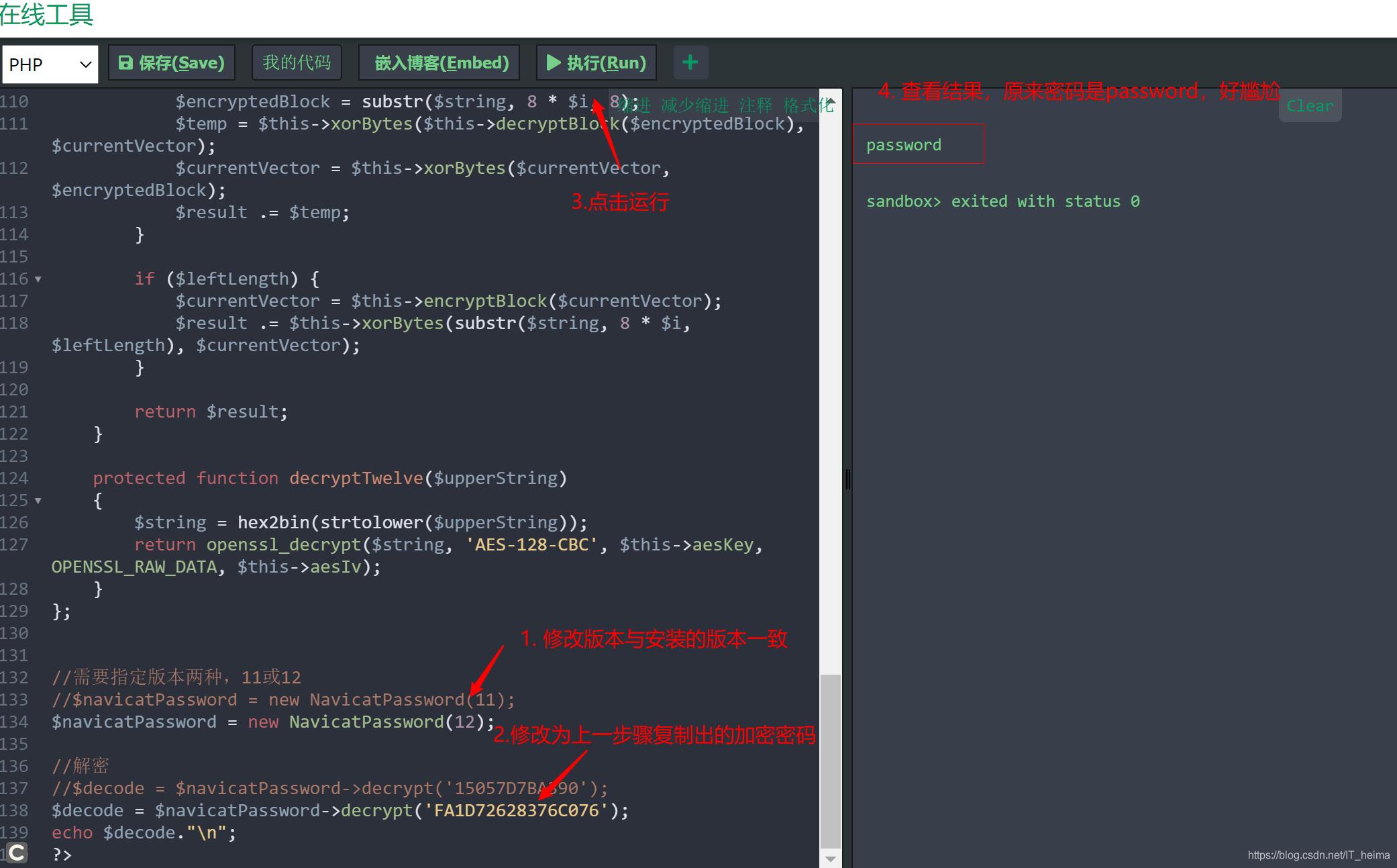 3、打开PHP在线运行工具,粘贴解密代码