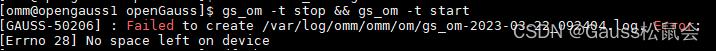 [omm@opengauss1 pg_xlog]$ ls -ltr | head -n 100 | awk '{print "mv "$9 " /tmp/xlog_mv_322/"}' | sh再尝试重新启动数据库。因为我的备库已经完全废弃了,只能指定以主库模型重启 加 -M primary参数。