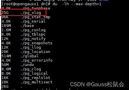[root@opengauss1 /]# du -lh --max-depth=1根据经验直奔data/dn目录,果然就是这里 ,pg_xlog下面产生了过多日志文件。