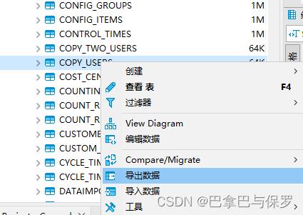 1、选择源头数据库的表、鼠标右击、选择导出数据