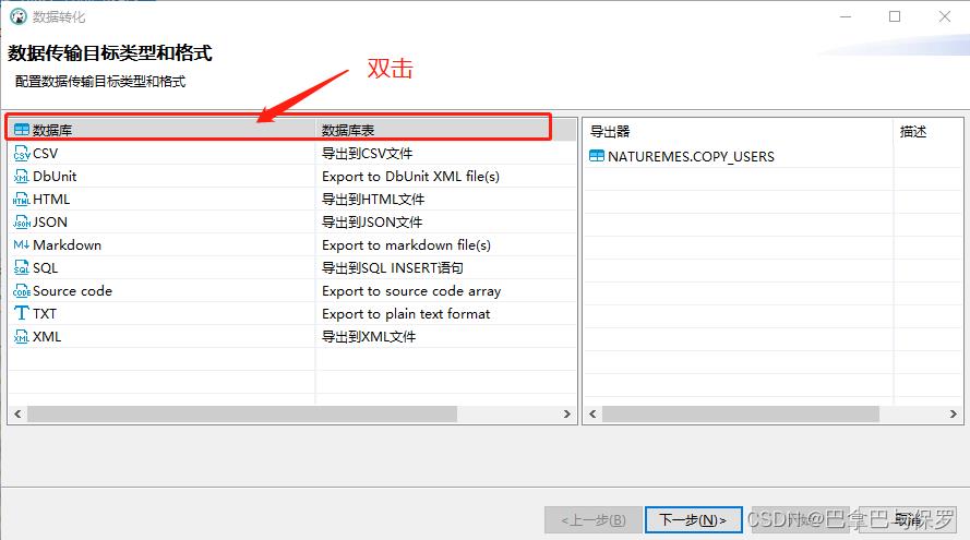 2、在数据转化弹框中,双击 ‘数据库,数据表’ 那一栏