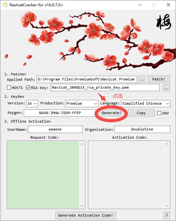 5、上一步成功之后,按照下图进行点击“Generate”,会自动生成一个注册码,然后点击“COPY”