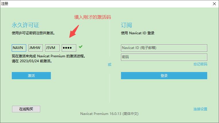 6、打开刚才安装的Navicat16,将上面生成的注册码复制到注册窗口中(注册窗在头部“帮助”选项下面),点击激活,