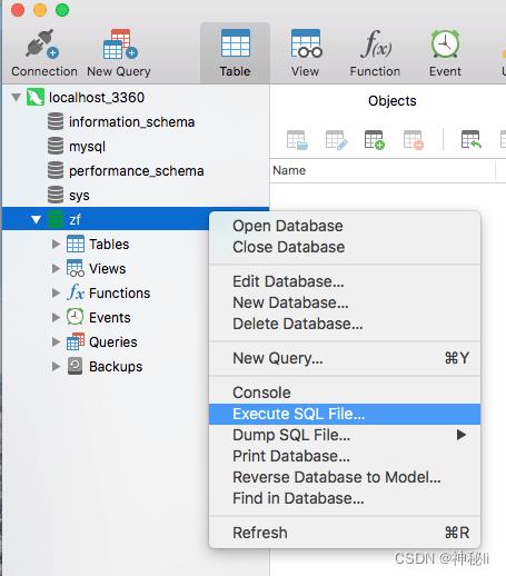 在新建好的数据库上右单击右键选择”Execute SQL File”。