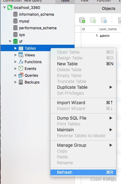 选中“Table”单击右键,再点击“Refresh”进行刷新。