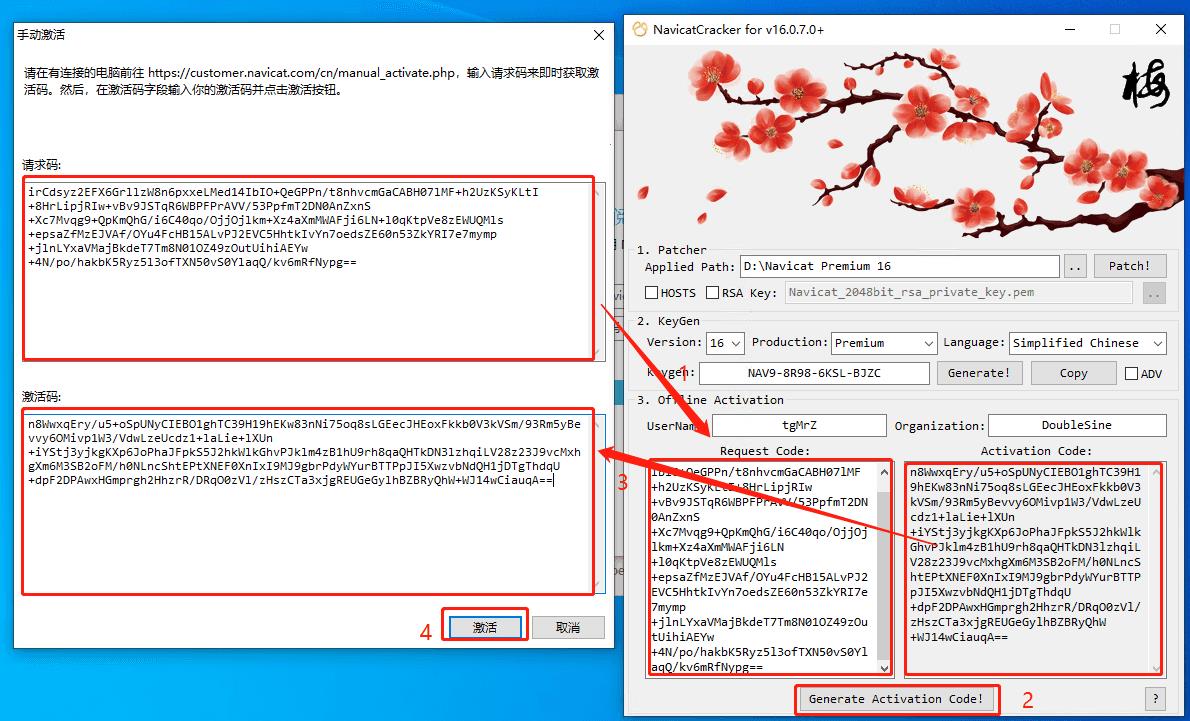点击【Generate Activation Code】;将生成的【激活码】复制到Navicat中;点击【激活】