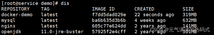 docker-demo 1.0 d6ab0b9e64b9 两7 minutes ago 3两7MB