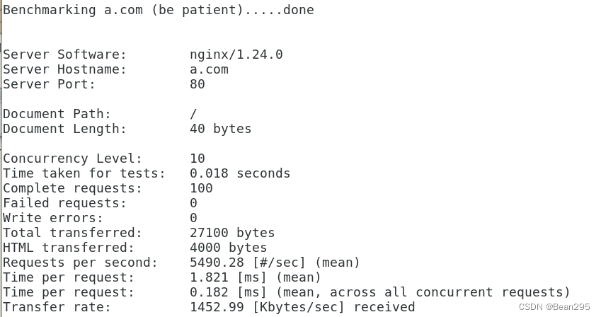 ab 是 apache 入止机能测试的东西 ;-n 100 -c 10:统共100次,分10次领送给 a.com